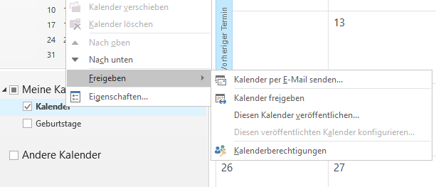 Wechsle in den Kalender. Klicke mit der rechten Maustaste auf Kaledner und wähle Freigen und Kalenderberechtigungen.