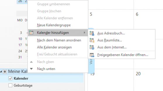 Klicke mit der rechten Maustaste auf Meine Kalender, wähle Kalender hinzufügen und Freigebene Kalender öffnen