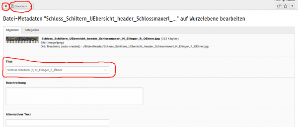 Im sich öffnenden Bildfenster wird der Copyright-Text im Titel-Feld eingegeben. Klicke jetzt auf Speichern und danach auf das X neben speichern.